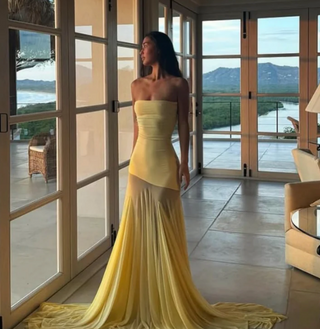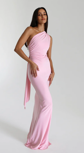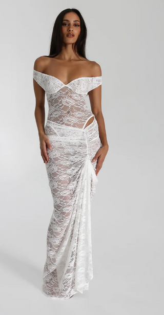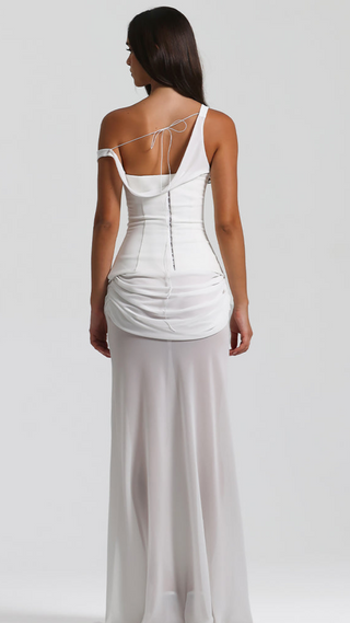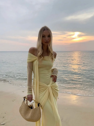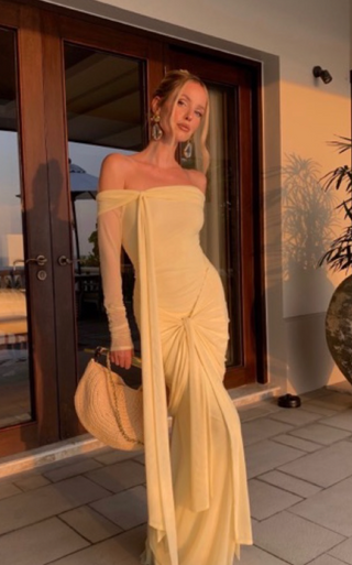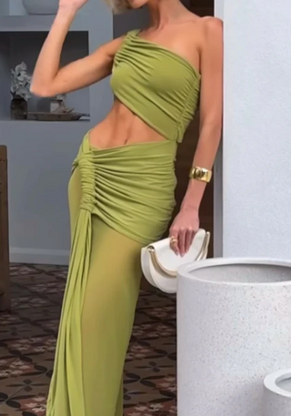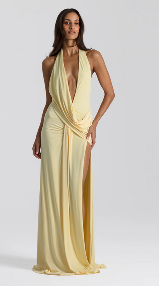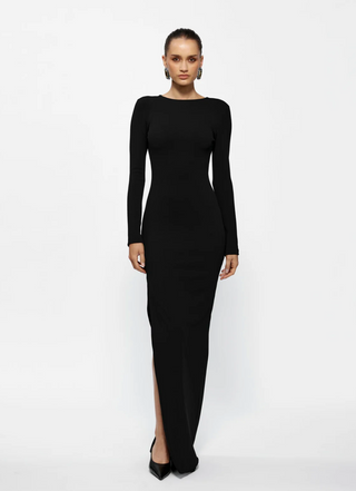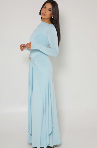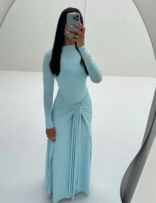 LYCRA LONG SLEEVE MAXI DRESS DEEP NECKLINE WITH METAL SHELL DECOR