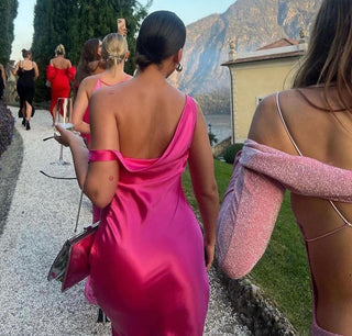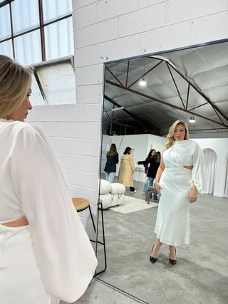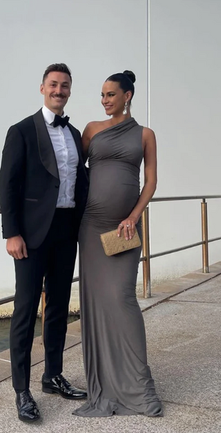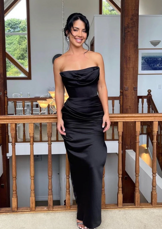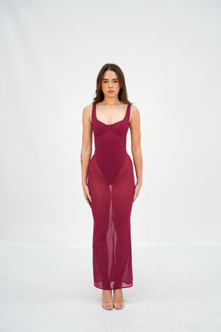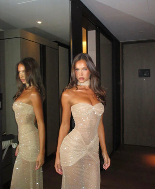 LYCRA LONG SLEEVE MAXI DRESS DEEP NECKLINE WITH METAL SHELL DECOR